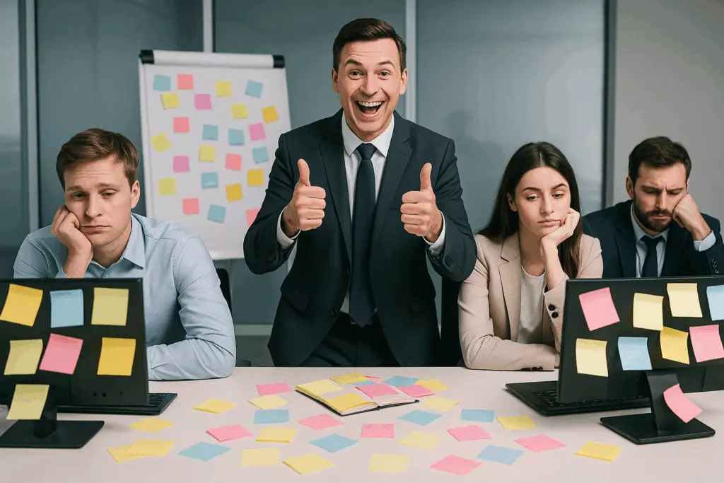 Así que sí, volverán los post-its, las dinámicas absurdas y los vídeos con música épica. Volverán las frases sobre “romper límites” mientras nadie toca el de la jornada laboral. Y al final, cuando todo se apague, quedará la misma oficina, el mismo miedo a pensar distinto… y una pared entera llena de ideas que nunca se atrevieron a implementar.