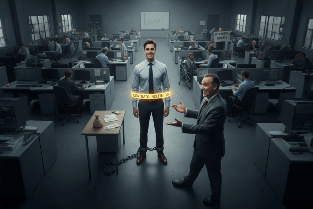 Y ahí viene la trampa: la empresa se desmarca de cualquier inversión real en ti. ¿Quieres un curso para mejorar? “No es el momento”. ¿Reconocimiento por tu trabajo? “Es que somos un equipo”. ¿Aumento de sueldo? “Ya te compensaremos con la experiencia”. Es la fórmula perfecta: mantenerte atado al escritorio con la promesa de un contrato que suena a oro, pero que se comporta como un anzuelo oxidado.