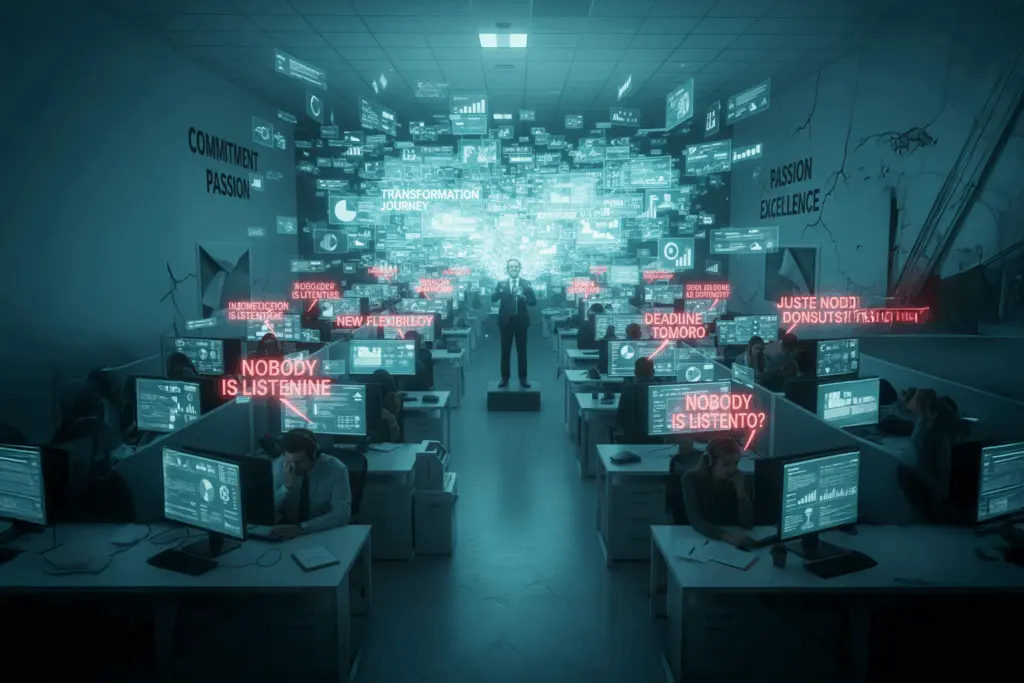 Mensajes que rebotan entre departamentos, que se publican en intranets que nadie lee, que acaban impresos en vinilos motivacionales junto a palabras como “compromiso”, “pasión” y “excelencia”.
